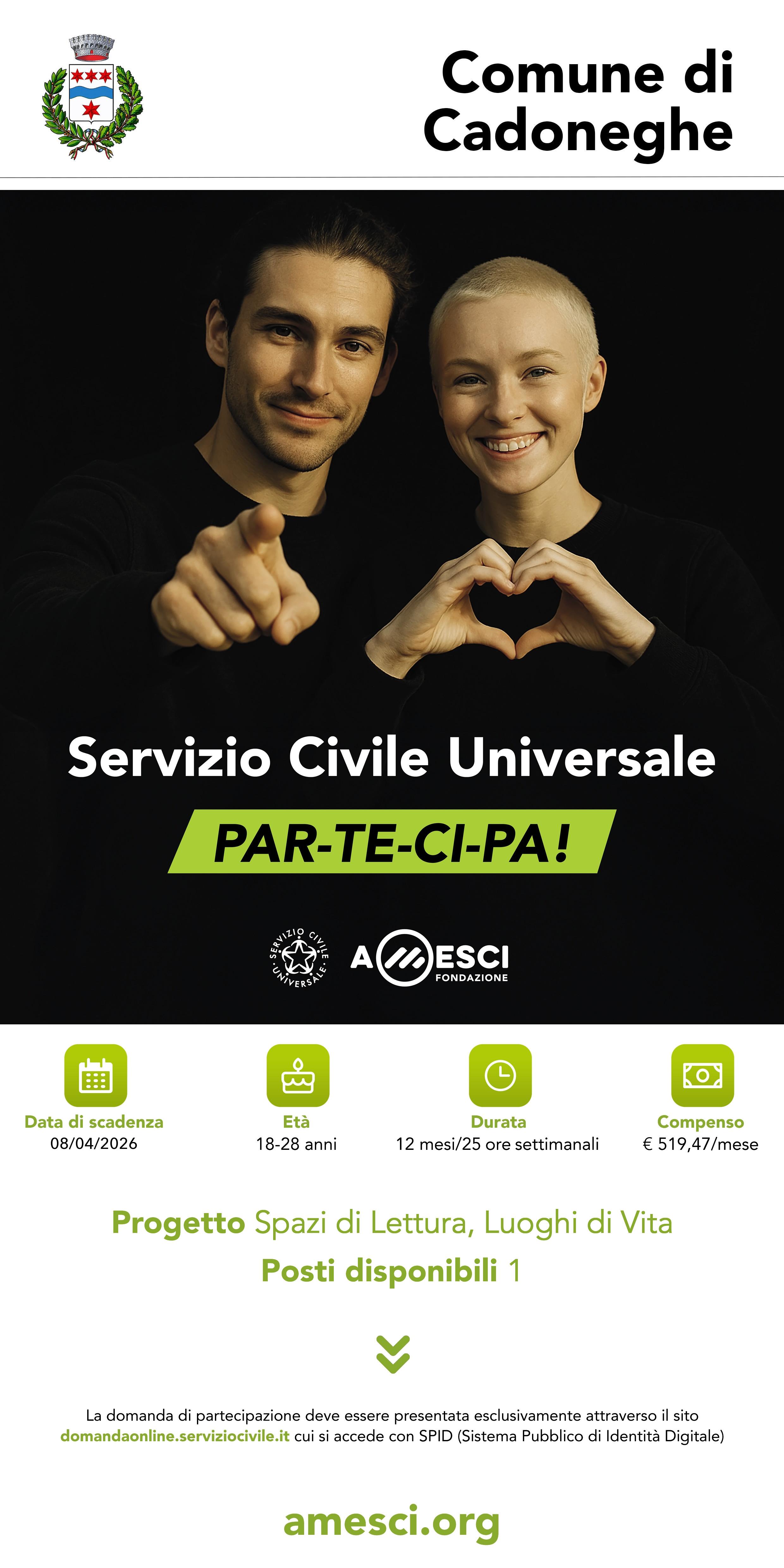 E' possibile presentare domanda di partecipazione fino alle ore 14:00 dell'08 aprile 2026, solo on line al sito: https://domandaonline.serviziocivile.it/ cui si accede con Spid.