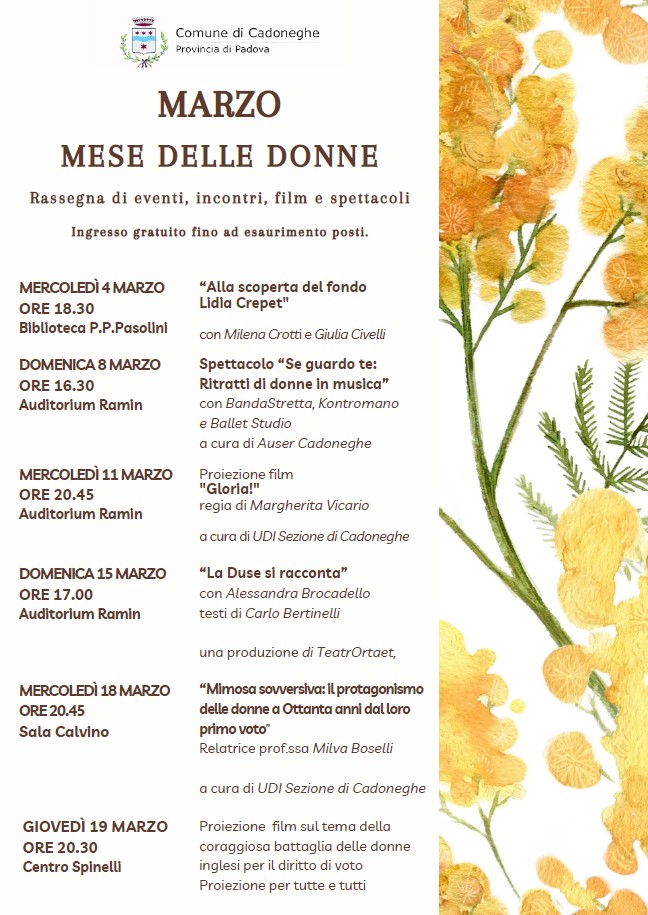 Mercoledì 18 Marzo alle ore 20.45 in sala Calvino promosso da Udi Cadoneghe incontro dal titolo "Mimosa sovversiva: il protagonismo delle donne a ottant'anni dal primo voto" relatrice Prof.ssa Milva Boselli